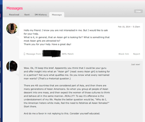 “Every Asian girl who has ever tried online dating, whether on POF, OKCupid, or Match has experienced it: messages from Creepy White Guys with Asian fetishes. I just got back into the dating scene and am already being bombarded with some absolutely horrifying messages. I’ve collected some of the best ones here, and I welcome any additions to my collection.”