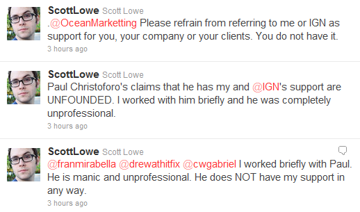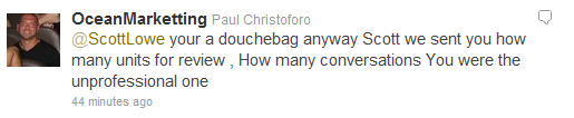 On December 27th, Scott Lowe, Executive Editor of the gaming electronics blog IGN Tech, sent a tweet[18] directed to @OceanMarketting disavowing any support for Ocean Marketing. Christoforo responded with a now deleted tweet directed at Scott Lowe calling him a “douchebag” and using a grammatically incorrect form of “you’re.”