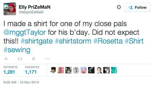 That day, Brooklyn-based journalist Rose Eveleth tweeted a photograph of Taylor with a sarcastic remark citing his shirt as an example of the male-biased work culture within the scientific community (shown below). Also on November 12th, Taylor’s friend Elly Prizeman tweeted she made the shirt for Taylor’s birthday, accompanied by the hashtags “#shirtgate” and “#shirtstorm.”