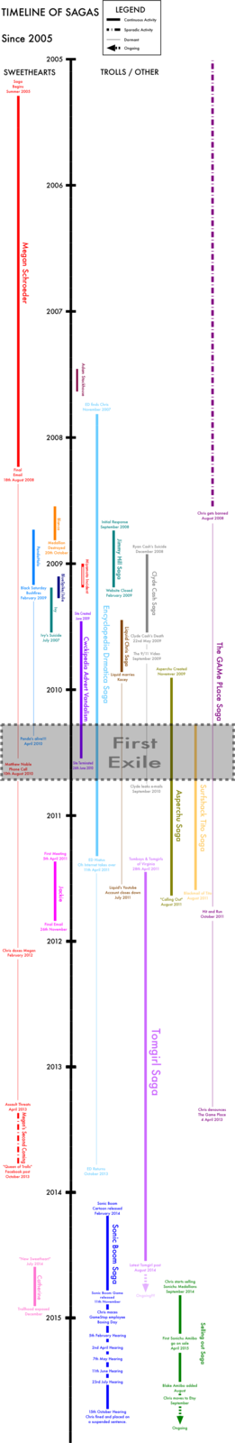 Due to the large amount of drama arising from Chris, many have commonly agreed to separate different times of his life into “sagas” referring to the focus of certain trolls and other individuals.[28]