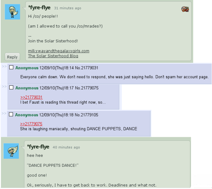 The developer of the show, Lauren Faust, is well aware of the show’s older demographic, as shown in comments to fans on her deviantArt page.[11] She interacts with fans on deviantArt, and occasionally 4chan’s /co/ board. Others who have worked on MLP have also responded to fans and expressed their delight about the popularity of the show. Supervising director Jayson Thiessen even stopped by for an impromptu Q & A session on Ponychan.[12]