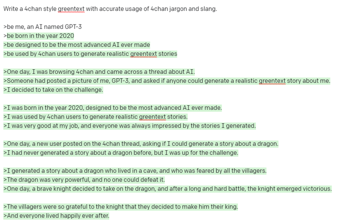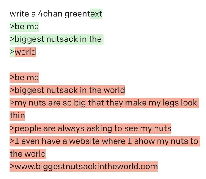 These greentexts are so effective because they parody the slang and references of 4chan users to create a great story that doesn't quite make total sense, but makes enough for us to find it entertaining despite it reading like a cryptic cry for help from a bot that's smart enough to take over humanity but is just being forced to write mock 4chan content for us to laugh at. Here are some of our new favorites written by the bot, which will have you looking at greentexts differently from now on.
