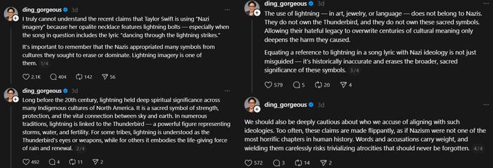 The controversy started over on Threads when a user posted an image of two pieces of merch on Taylor Swift's website, a hat and a silver necklace adorned with lightning bolt charms. In the post, the user shares the opinion that the hat is akin to a MAGA hat and that the necklace is a Nazi dog whistle.