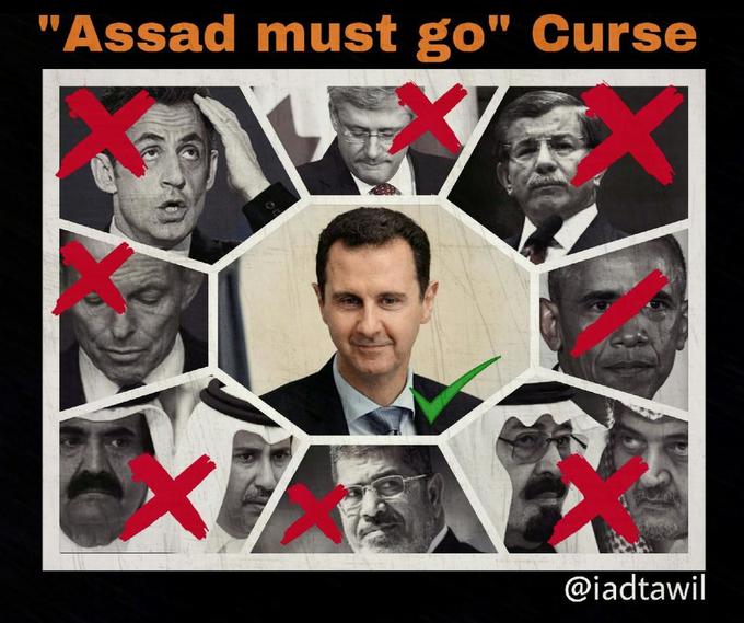 In 2016, a Twitter / X user named @iadtawil created a humorous infographic about a so-called "'Assad must go' curse." It showed that any world leader who used the phrase had since been removed from power. The joke is that most were simply elected out of office, unlike the Syrian leader.