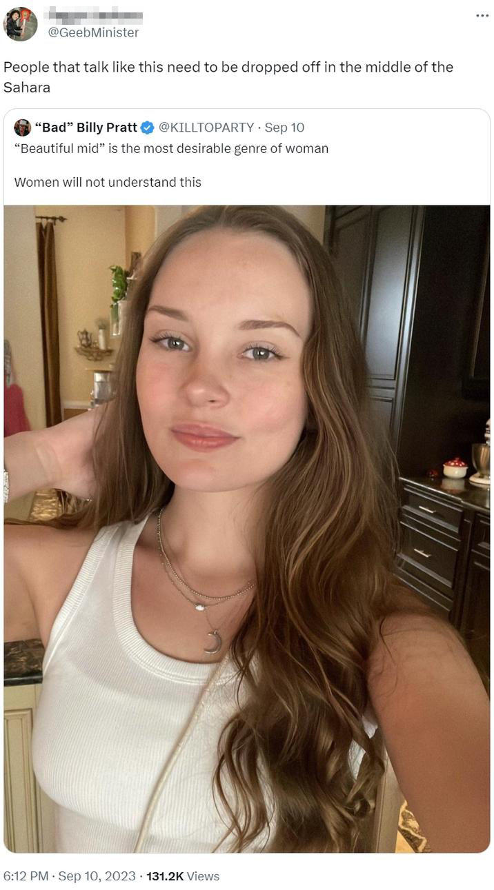 In September 2023, X user @KILLTOPARTY posted a photo of a conventionally attractive woman, captioned, "Every man simply wants a beautiful mid to call his own. Women will not understand this." The September 9th post gathered over 9,100 likes in two weeks.