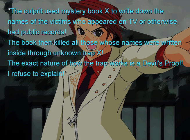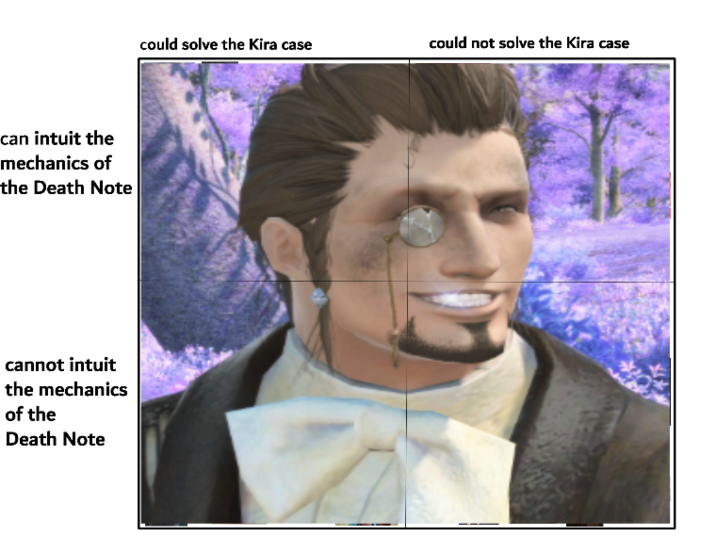 In October 2023, X user @akie_works posted a grid meme split along an x-axis indicating "can" or "can't" solve the case, and a y-axis indicating "can" and "can't intuit the mechanics of the Death Note."