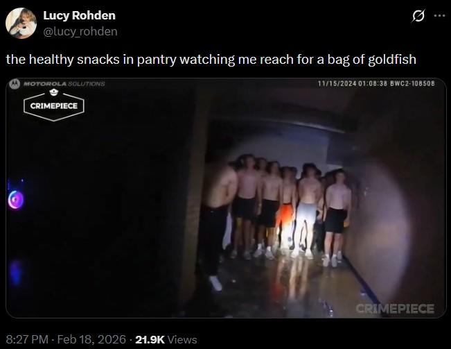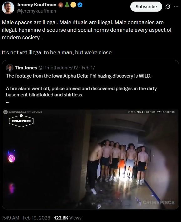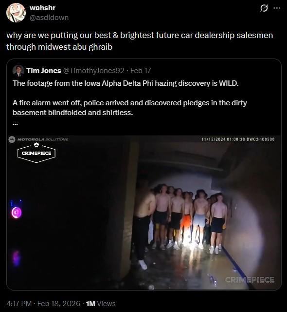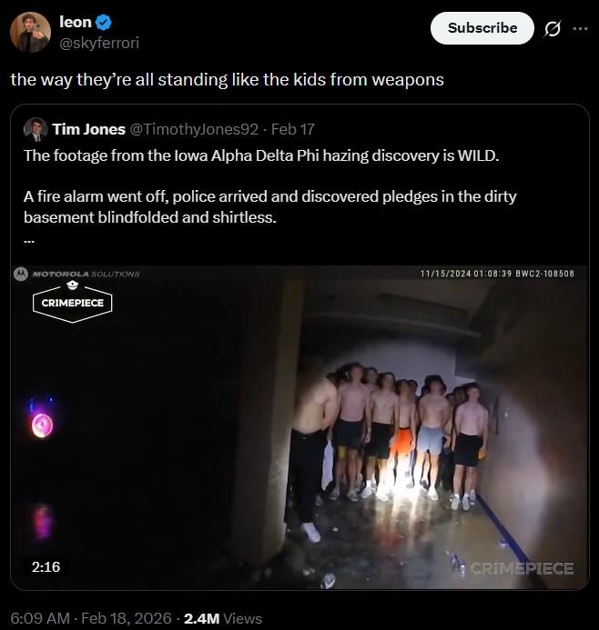The police bodycam video was actually taken back in 2024, but was only released online this past week. In the video, police respond to a fire alarm at the Iowa frat house only to find a bunch of shirtless frat pledges in the basement. Nobody wants to explain what they're doing there, but purportedly it was part of a hazing ritual.