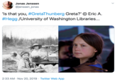 That day, Twitter [3] user @JackSamStrange posted a photograph that compares the two. They wrote, "So, ‘Greta Thunberg’ is in a photo from 120 years ago, and it’s my new favourite conspiracy. Greta’s a time traveller, from the future, and she’s here to save us." The tweet received more than 28,000 likes and 9,600 retweets in less than three days (shown below).