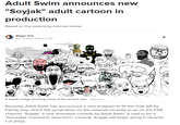 Adult Swim Soyjak Cartoon refers to a hoax news headline announcing that Adult Swim, after losing syndication rights for Family Guy, will fill the timeslot with a Soyjak adult cartoon series. The fake headline appears to have first been uploaded to 4chan, spreading across the Internet over the course of mid-October. There is no Soyjak cartoon in production.