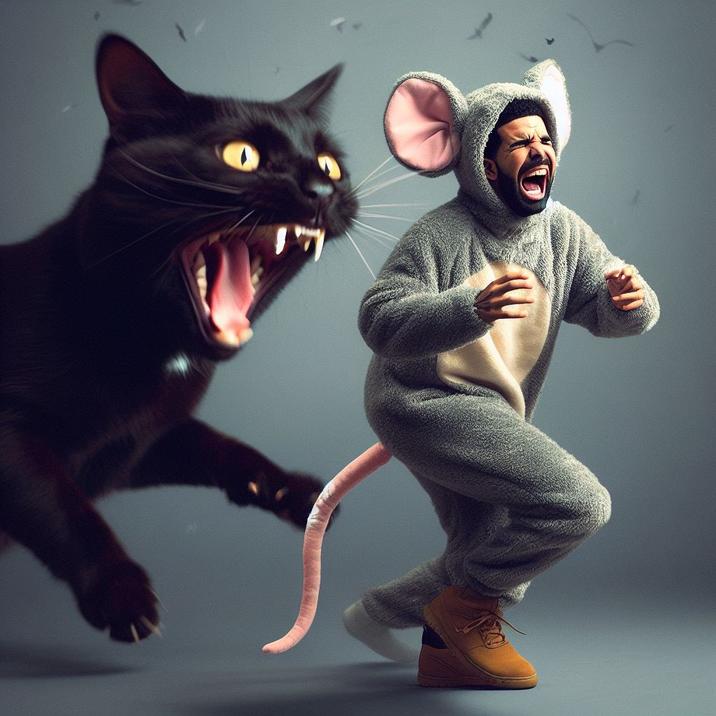 On October 4th, 2023, YouTuber Justin Whang posted a screenshot of Bing Image Creator declining a request to generated a cartoon with Jackie Chan in it,[4] with another X user replying that using nicknames such as "Tay Swift" instead of "Taylor Swift" allowed to circumvent the limitation,[5] and user @arsenolofheroin[6] posting an AI-generated image of Drake and saying that the rapper was the only person "allowed to be AI clowned on" (post shown below, left). Whang proceed to post[7] multiple AI-generated images of Drake, with several of them going viral (example shown below, right).