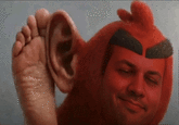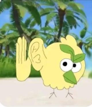 Angry Bird Ear or Angry Birds Ear, also known as Angry Bird Listening, I Repeat Back Anything That's Said to Me and I Am All Ears MF, is a reaction image meme depicting a red bird from the video game series Angry Birds (named Red) with a large human hand and ear with a raised eyebrow, signifying that he's listening to someone. The graphic originally comes from an app called Talking Red, similar to Talking Tom, that featured the red bird sitting on green grass, where he would supposedly repeat back something the user would say, listening with the hand and ear image.