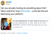 On January 27th, @Jaack[3] tweeted Jolto's YouTube video with the caption "Can you actually fucking do something about this? Take a stand for once @YouTube – cunts like this are destroying your platform" which received over 8,400 likes and 600 retweets in two days. That same day, Redditor ethanlou posted driipboz "Press E to launch that little shit" image to r/dankmemes[4] which accumulated over 520 points (96% upvoted) in two days. Bothe PopBuzz[6] and Dexerto[5] covered the story.