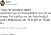 The origins and exact definition of the movement are unclear. The earliest known mention of the term was posted to Twitter[1] by @CorgiHell on August 28th, 2021, in response to a tweet suggesting the show Ted Lasso might make men "take therapy seriously." One user wrote, "Weren't we already compelled to take therapy seriously because of the Sopranos or whatever? I can't keep track," to which @corgihell responded, "The Sopranos doesn't depict therapy as a magical cure that turns you into a quippy squeecore sitcom guy. Major flaw of the show, IMO." On September 7th, @CorgiHell replied to a tweet and asked, "Is there a term, roughly equivalent to 'new wave' or 'cyberpunk,' describing the current dominant trend in SF/F? (Markers of the style: diversity assumed as baseline, clear influences from romance novels, genre fluidity)" suggesting "squeecore" (shown below).[2] This definition is largely rooted in criticism of progressive politics.