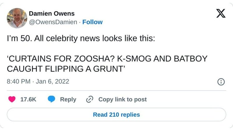 On June 1st, 2022, X user Damien Owens (@OwensDamien) posted, "I'm 50. All celebrity news looks like this: 'Curtains for Zoosha? K-smog and Batboy caught flipping a grunt." The post gained over 17,600 likes in an undefined period of time. As of 2026, the post and account no longer appear to be active.