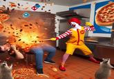 Later on October 17th, 2023, TikToker[3] @gnomecurtis posted another slideshow featuring AI-generated Domino's images (examples shown below), gaining roughly 14,600 plays and 1,000 likes in nine days. Some of the photos also featured Ronald McDonald from McDonald's having conflicts with raccoons inside the Domino's (example shown below, right).