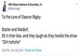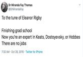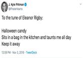 "Eleanor Rigby" Parodies refer to social media posts written in a way that invites readers to read the words to the tune of the popular Beatles song, "Eleanor Rigby." They're primarily popular on Twitter, where the parodies are often about current trends or memes.