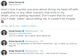 Aimee Carrero @aimeecarrero · 10h Here's how it works: you post about slicing my head off with a guillotine, or any other scenario that ends in my death.you're getting reposted. Don't want that for you? Don't make "jokes" about killing me. It couldn't be simpler. ! Tim Rock @Mrtimrock · 10h @lesbianbabadook come play with me, lI'm on your level alondra @Heyparadiamonds Replying to @Mrtimrock @aimeecarrero and @lesbianbabadook ok checkmark twitter 1:28 AM - Apr 9, 2020 - Twitter for iPhone