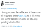On March 19th, 2020, Twitter user @BeeBabs[4] retweeted @AmandaRosenberg stating "rta oa selling 'corona merch' i cant. these celebs are making me want to be around ppl" with "it's really exposing how little they understand about like….anything" (shown below, left). The tweet garnered over 1,300 likes and 140 retweets in five days. That same day, after many Twitter users criticized the merchandise Twitter user @PopCrave[5] replied saying, "RitaOra makes it clear that all the #StopTheSpread merch campaign proceeds will go to the COVID19 Solidarity Response Fund" (shown below, right). The tweet gained over 160 likes and 20 retweets in five days. Vogue[1] and PopBuzz[2] published articles on the clothing line.