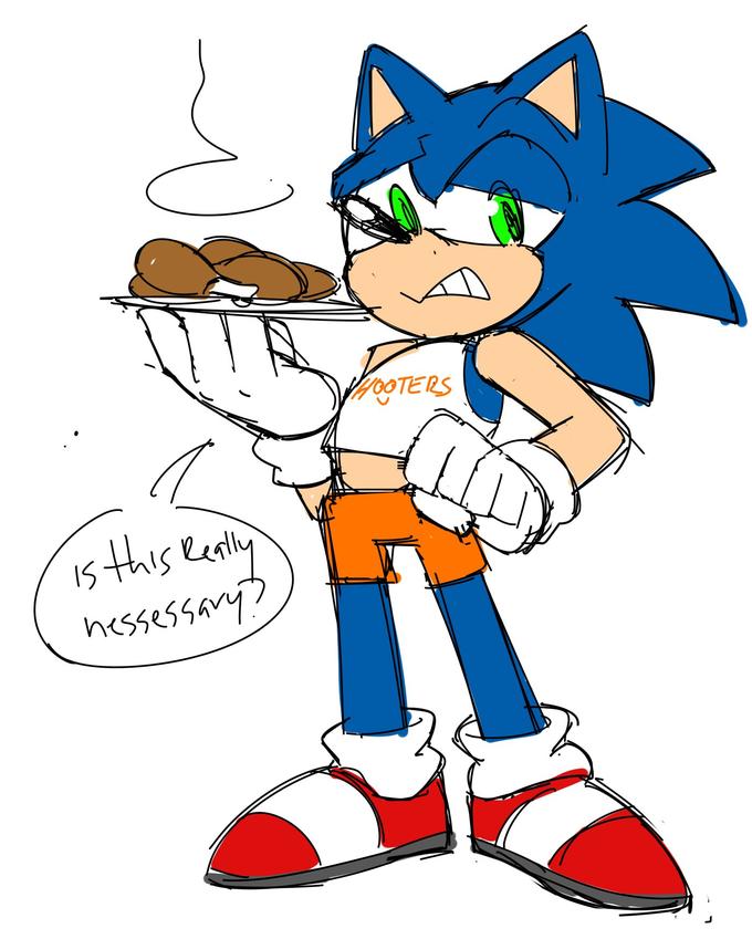 On September 23rd, Twitter user @TheChaosSpirit[1] posted an illustration of Sonic the Hedgehog wearing a Hooters tanktop (shown below). That day, Twitter user @neonspindash uploaded[2] a similar illustration of Sonic serving a beer while dressed in a Hooters uniform (shown below, right).