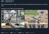 On July 30th, 2023, Twitter[4] user @MattBinder posted a tweet that read, "Elon Musk’s giant X logo on top of the building formerly known as Twitter HQ…appears to be held up by sandbags." The tweet contained photos of the X-shaped structure on top of the Twitter HQ building, with black sandbags weighing down the base of the signage. The tweet gathered over 6,000 likes in a day (seen below, left).