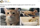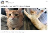 Within several minutes of @rambites' post on March 18th, 2022, his followers on Twitter started reposting photographs of the cat, claiming it was theirs. For example, within 15 minutes of @rambites' initial post, Twitter[2] user @cosmews claimed that the cat was theirs. Within one minute, Twitter[3] user @nyavemew claimed the same (tweets shown below, left and right).
