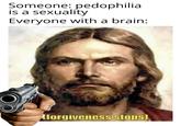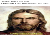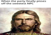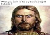 Forgiveness Stops refers to a descriptive noise image macro of Jesus Christ captioned with the phrase "forgiveness stops." An offspring of the Jazz Music Stops meme, the image macro received initial spread in April 2018, regaining popularity in February 2021, primarily on Reddit.