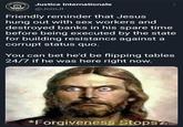 The image macro is based on the painting "Jesus the Christ" by Del Parson (shown below, left).[1] The exact source of origin of the image macro is unknown. On April 20th, 2018, an anonymous Imgur[2] user made the earliest found repost of the macro alongside the caption "forgiveness stops" with a closeup of Jesus' face (shown below, right).