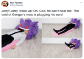 what if we kissed we kissed on the 3 gengar tongue bed |Caitie can't think of a funny display name @ghostpoot 00 rolls up to the slumber party with my gengar vore pillow lilac @nxgisa having a rough day just gonna shove my head in gengar's mouth for a bit merritt k 000 @merrittk What if we spooned on the Gengar tongue blanket 7:53 PM · Jan 7, 2021 · TweetDeck