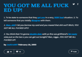 GMFU, also known as You GMFU or Got Me All Fucked Up, is an acronym and slang term that stands for the phrase "you got me fucked up." The catchphrase is commonly employed to express one's reaction to something, often conveying negative feelings about something, but it's also used to say that someone has been misunderstood or misread. The slang term was popularized and received viral usage on the internet after 2016, though the phrase has been somewhat common since the 1990s.