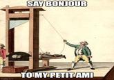 A Guillotine is an execution apparatus built to efficiently carry out executions by beheading. Though similar execution machines could be found in the middle ages, the guillotine is widely associated with the 18th century French Revolution, during which, members of the French noble class were beheaded.[11] In memes, guillotines are typically used in the discussion of class wars and references to the apparatus are made in reaction to tone-deaf actions or statements from those with a high income.