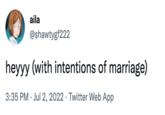 On July 2nd, 2022, Twitter user @shawtygf222[1] tweeted, "heyyy (with intentions of marriage)," gaining over 36,000 retweets and 237,000 likes (shown below).