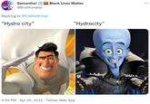 On October 16th, 2020, Twitter[6] user @bodaciousbats posted the earliest viral meme about the debate, which referenced Megamind's peculiar pronunciation of Metro City as "metrocity." The post gained over 4,100 retweets and 26,200 likes in two years (shown below, left).