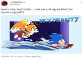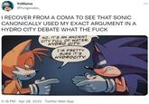 On April 25th, 2022, Twitter[8] user @ThatSoni posted photographs of pages from the 2022 Free Comic Book Day issue of Sonic the Hedgehog comic that was acquired early by him. On one of the pages, Sonic and Tails have a brief argument over the correct way to pronounce Hydrocity, failing to reach a consensus (panels shown below). Later that day, Twitter[9] user @CrafterArmys posted a cropped panel of Tails and Sonic arguing, with the tweet gaining over 6,000 retweets and 52,900 likes in two months.