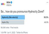 On June 11th, 2022, SEGA's official Twitter[10] account launched a poll for the correct pronunciation of Hydrocity, with "Hydrocity (like velocity)" beating "Hydro City" 50.5 percent against 49.5 percent of the votes and a total of nearly 100,000 users voting (shown below).