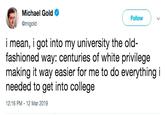 The trend started on March 12th, 2019, when Twitter user @migold[1] joked he was able to get into college thanks to white privilege, gaining over 230 retweets and 1,600 likes (shown below).