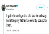 The format grew more popular after Ben Dreyfuss, son of actor Richard Dreyfuss, tweeted, "I got into college the old fashioned way: by letting my father’s celebrity speak for itself," gaining over 3,600 retweets and 53,000 likes (shown below, left). This led to the format spreading on Twitter, with some responses sincere responses and others jokes. Twitter user @SJSchauer tweeted "Lori Loughlin paid 500K for her daughter to get into USC and that's fucked up. I got into college the old fashioned way AKA sucking the deans dick and blackmailing him and his family," gaining over 1,600 retweets and 22,000 likes (shown below, right).