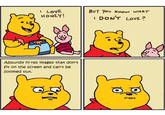I Love Honey, But You Know What I Don't Love refers to an exploitable webcomics series featuring the fictional characters Winnie the Pooh and Piglet eating honey. Across the first two panels, Pooh says, "I love honey! But you know what I don't like." In the final two panels, users have replaced the thing that Pooh does not like for comedic effect.