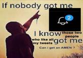 The exact origin of the image macro combining an image of a man pointing at the sky and the caption "If nobody got me, I know God got me. Can I get an amen?" is unknown. On November 2nd, 2014, Facebook[1] page Godly Thought, Quote, And Sayings made the earliest found post of the macro (shown below), with the post gaining over 760 reactions and 1,400 shares in six years.