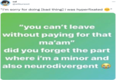 On July 16th, 2021, Instagram[11] page @grimesbangs posted an Instagram text post that reads "'you can't leave without paying for that ma'am' did you forget the part where I'm a minor and also neurodivergent," gaining over 2,000 likes in two months (shown below).