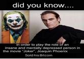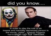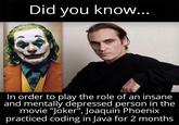 In Order to Play the Joker, Joaquin Phoenix… is a series of image macro memes that imagine actor Joaquin Phoenix preparing himself for the role of Joker by undergoing various mentally and psychologically taxing challenges. Spawned by a viral Reddit post, the format gained major prominence online in late 2020 where people use the phrasal template by recaptioning the bottom text.