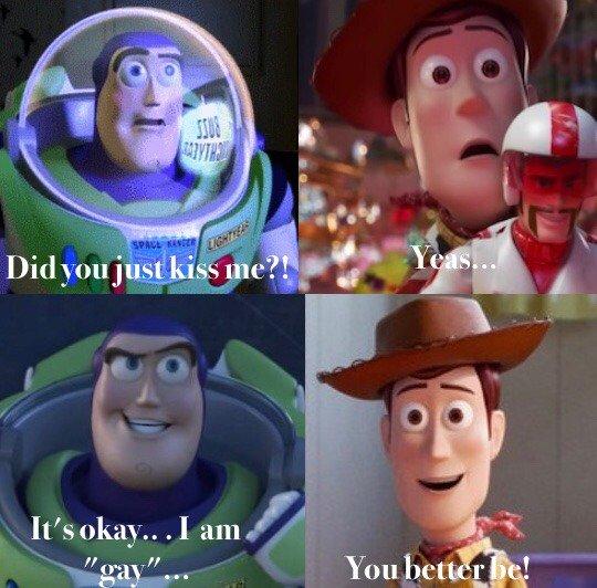 On June 26, 2019, Twitter[3] user @Calazotauvu uploaded a version of the meme that uses Buzz Lightyear and Woody from Toy Story 4 as a way to flip it into being different characters from the original two, as well as making it into gay instead of lesbo, earning 400 likes in two years (shown below).