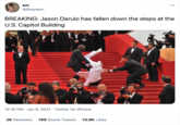 Over the next few years, people continued to share the image, joking that Derulo had fallen down the steps at different events. On January 5th, 2020, Twitter[5] user @gmrdth tweeted, "Jason Derulo has fallen down the stairs at the Golden Globes!!!" The tweet received more than 63,000 likes and 8,000 retweets in less than one year (shown below, center).