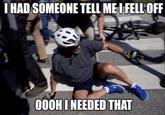Joe Biden Falls Off Bike is a viral video of U.S. President Joe Biden falling off a bicycle during a promotional bike ride in Delaware. The stumble resulted in multiple memes, reactions and tweets in June 2022, many in regards to his age, health and condition to be running the country. It also prompted a response from former President Donald Trump who said, "I make this pledge to you today, I will never, ever ride a bicycle." Additionally, a parody headline from news outlet The Atlantic called the bike crash "heroic" but was later proven to be fake.