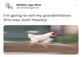 Other memetic reactions centered on the concept of Hawley running. For instance, on July 21st, Twitter[10] user middleageriot tweeted an image macro of a chicken running, captioning it, "I’m going to tell my grandchildren this was Josh Hawley," and earned roughly 3,900 likes in less than a day (shown below, left). On July 22nd, Twitter[11] user and contributor for Vanity Fair Franklin Leonard tweeted, "The Missouri Dems should host an annual Josh Hawley 5K as a fundraiser," earning roughly 36,600 likes in less than a day (shown below, right).