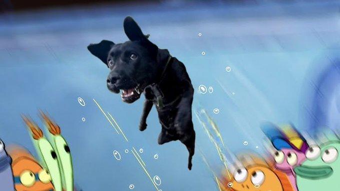 On November 16th, 2025, X[7] user @JoshuaTookes posted an edit that adds the dog to the last scene from The SpongeBob SquarePants Movie where SpongeBob jumps into the air for a freeze-frame, garnering over 81,000 likes in three days.