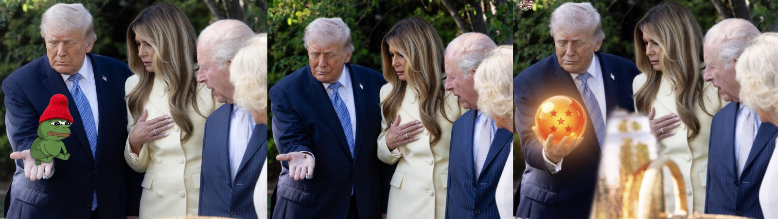 The meme originates from a widely circulated photo showing Donald Trump holding a small bee in the palm of his hand, while Melania Trump and King Charles III stand beside him, all focusing intently on the tiny object. The composition, Trump presenting something while others react with curiosity or concern, quickly turned the image into a versatile meme template. Online users began replacing the bee with various edited objects, ranging from absurd items to symbolic references, making it appear as though Trump is presenting anything from tiny memes to controversial topics. The serious expressions contrasted with the trivial or ridiculous edits helped drive its humor and adaptability.
