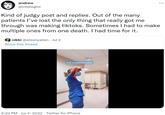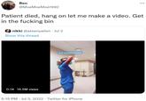 Prior to June 26th, 2022, TikToker[1] and nurse Olivia Vanderford (@olivia_tylerr33) uploaded a TikTok video in which she showed her reaction to a patient dying and her having to "shake it off" and complete the rest of her shift (original post no longer available). On the same day, Twitter[2][3] user @ateenyalien uploaded the TikTok, commenting, "aw man can't believe my patient died let me go make a tiktok rq." The video gained over 14.5 million views, 1,300 retweets and 20,800 likes in five days (shown below).