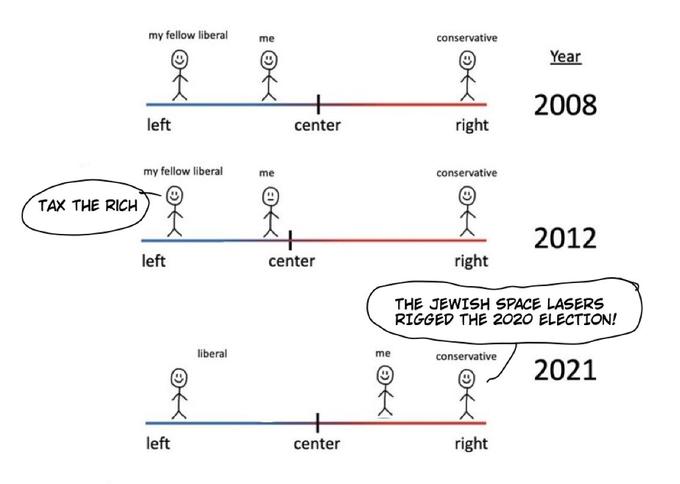 My Fellow Liberal? refers to a cartoon that illustrates a perceived shift in the Overton window between 2008 and 2021 towards the left. After April 2022 when entrepreneur and billionaire Elon Musk reposted the comic, it became a subject of edits and parodies as an exploitable meme online, primarily on Twitter.