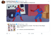 On December 19th, 2022, Vulture published a cover article by Nate Jones describing the rise of the "nepo baby" term in 2022 and profiling some entertainment industry figures.[6] The article began with a description of the viral @MereimIsTired tweet and its reception, profiling the author and their life story. Then, sourcing from interviews with casting directors and others, the article described an entrenched culture in Hollywood where family connections lead to career success. The piece was accompanied by another piece featuring a series of charts describing the family connections of famous Hollywood figures.[7]