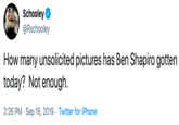 Washington Post writer Holly Figueroa O'Reilly tweeted,[3] "OMFG Ben Shapiro are you okay? 🤣🤣🤣 Unless Mr. Boofing has an incredibly noteworthy penis, I'm not sure anyone would remember specifics about it. What a weirdo. 'Nobody has yet described Kavanaugh's genitalia.'" Within 24 hours, the tweet received more than 2,900 likes and 550 retweets (shown below, right).